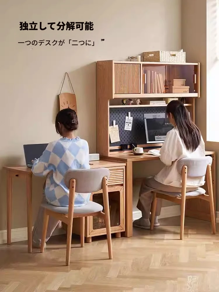 オーガニック無垢材使用!シンプルでスタイリッシュなデザインのデスク&書棚セット。狭いスペースにぴったりな伸縮可能な学習デスクで、快適な作業環境を実現!