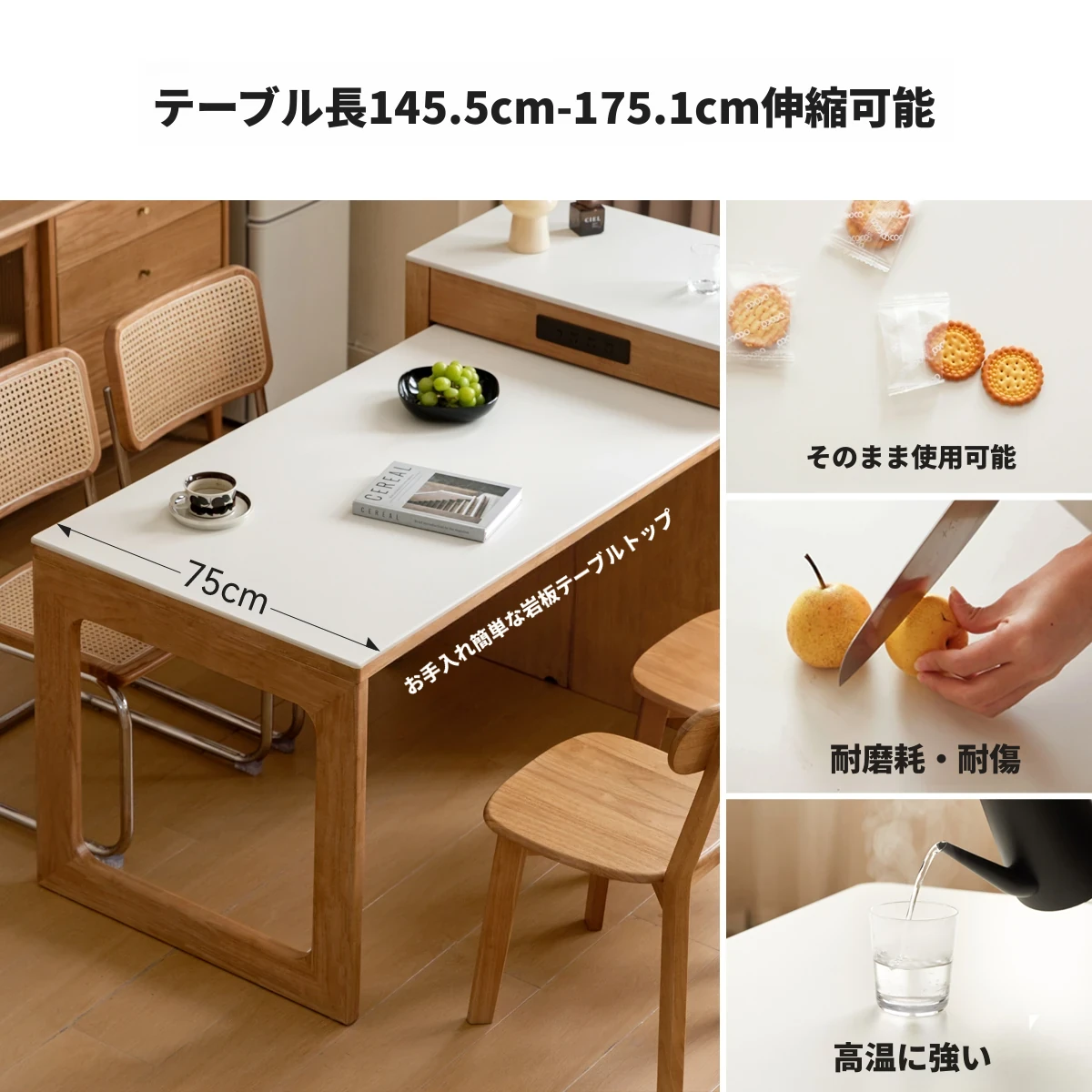 源氏木语×ヴィシャ実木アイランドテーブル|伸縮可能なダイニングテーブル|ナチュラルな木材と高級感ある岩板デザインで、家族団らんの時間をもっと特別に。