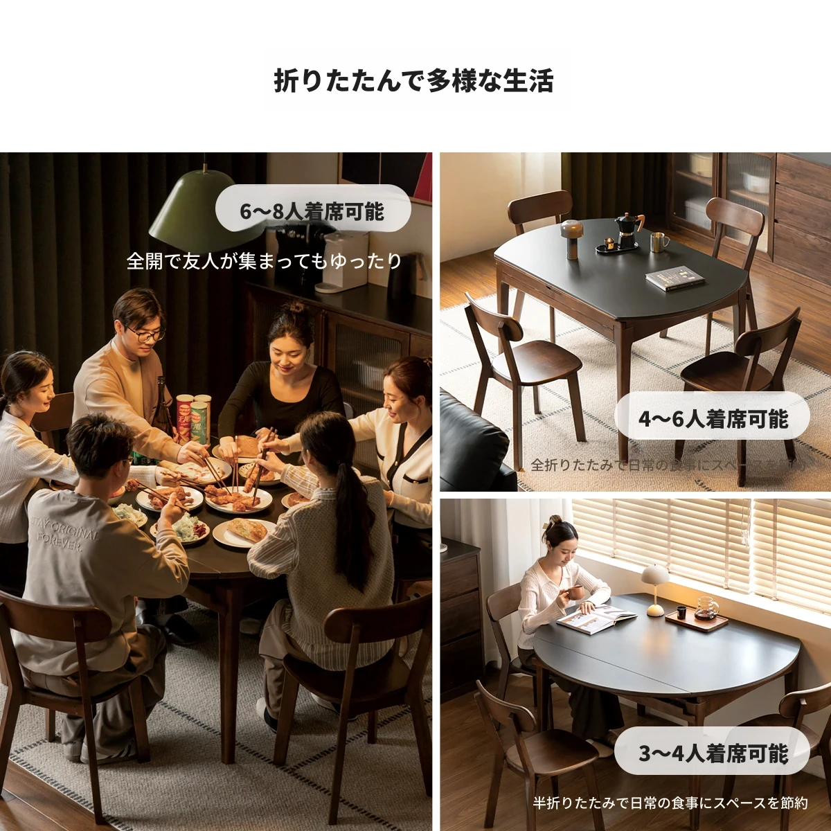 源氏木語×ヴィシャ実木折りたたみダイニングテーブル - 小型住居に最適な伸縮可能な丸テーブル。レトロなデザインで、岩板の上質感を演出。おしゃれで機能的な食卓をお楽しみください!