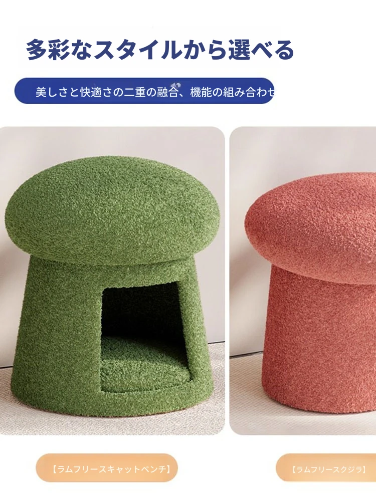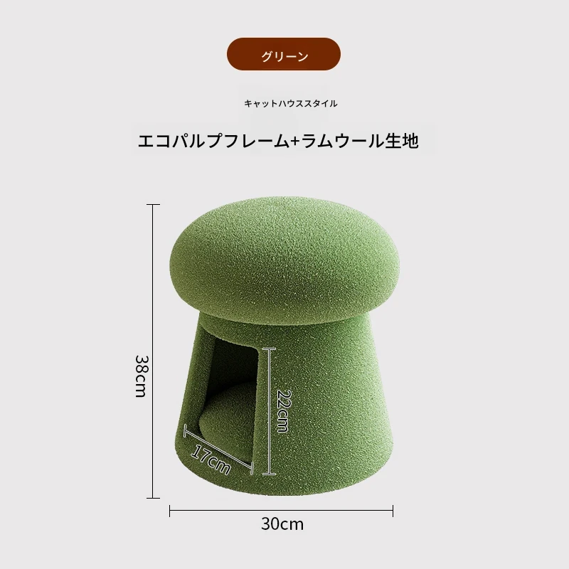 【グリーンの猫ベッド兼靴ベンチ】高密度ラムフリース+無垢材フレーム