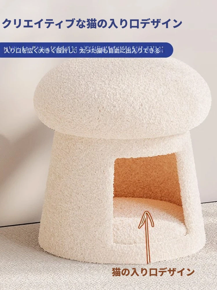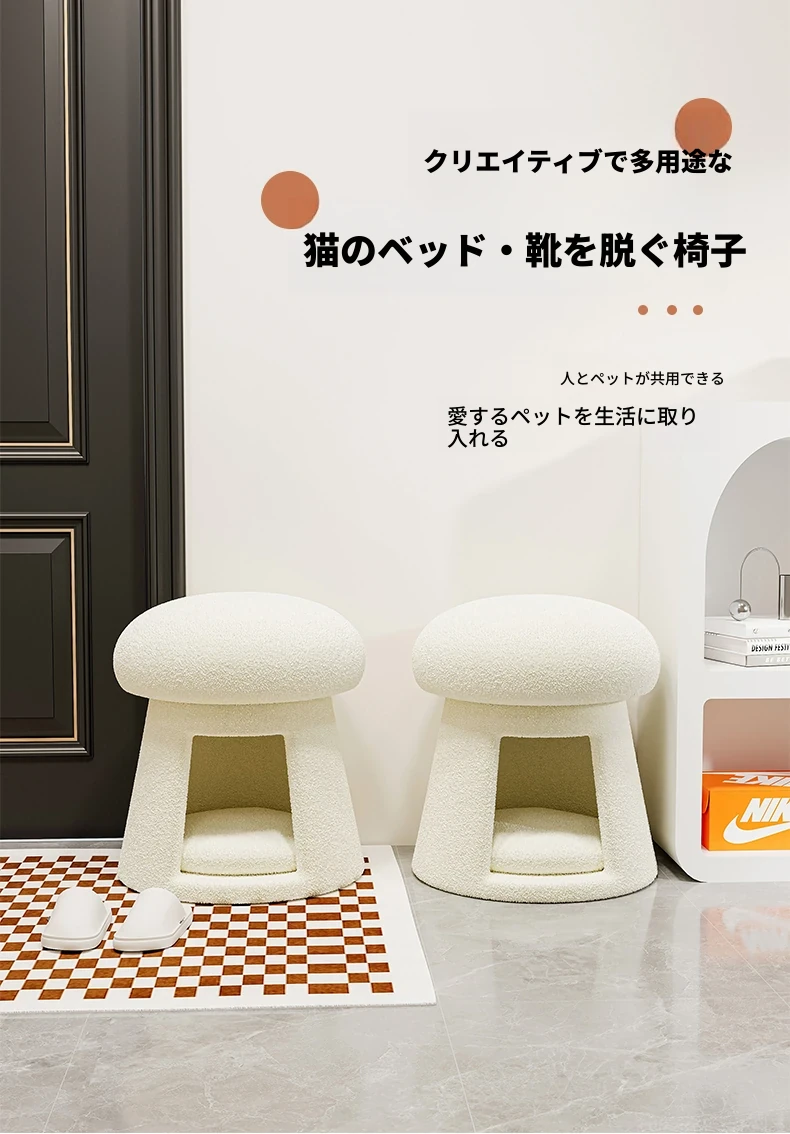 【ホワイトの猫ベッド兼靴ベンチ】高密度ラムフリース+無垢材フレーム