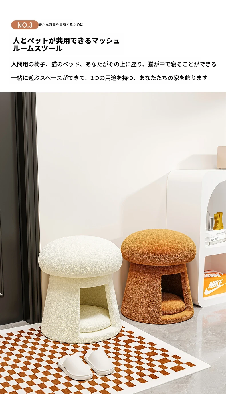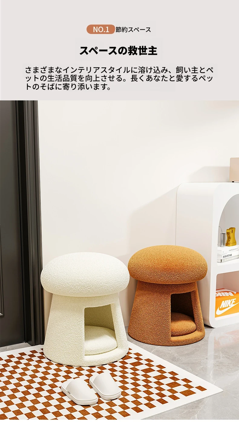 【ブラウンの猫ベッド兼靴ベンチ】高密度ラムフリース+無垢材フレーム