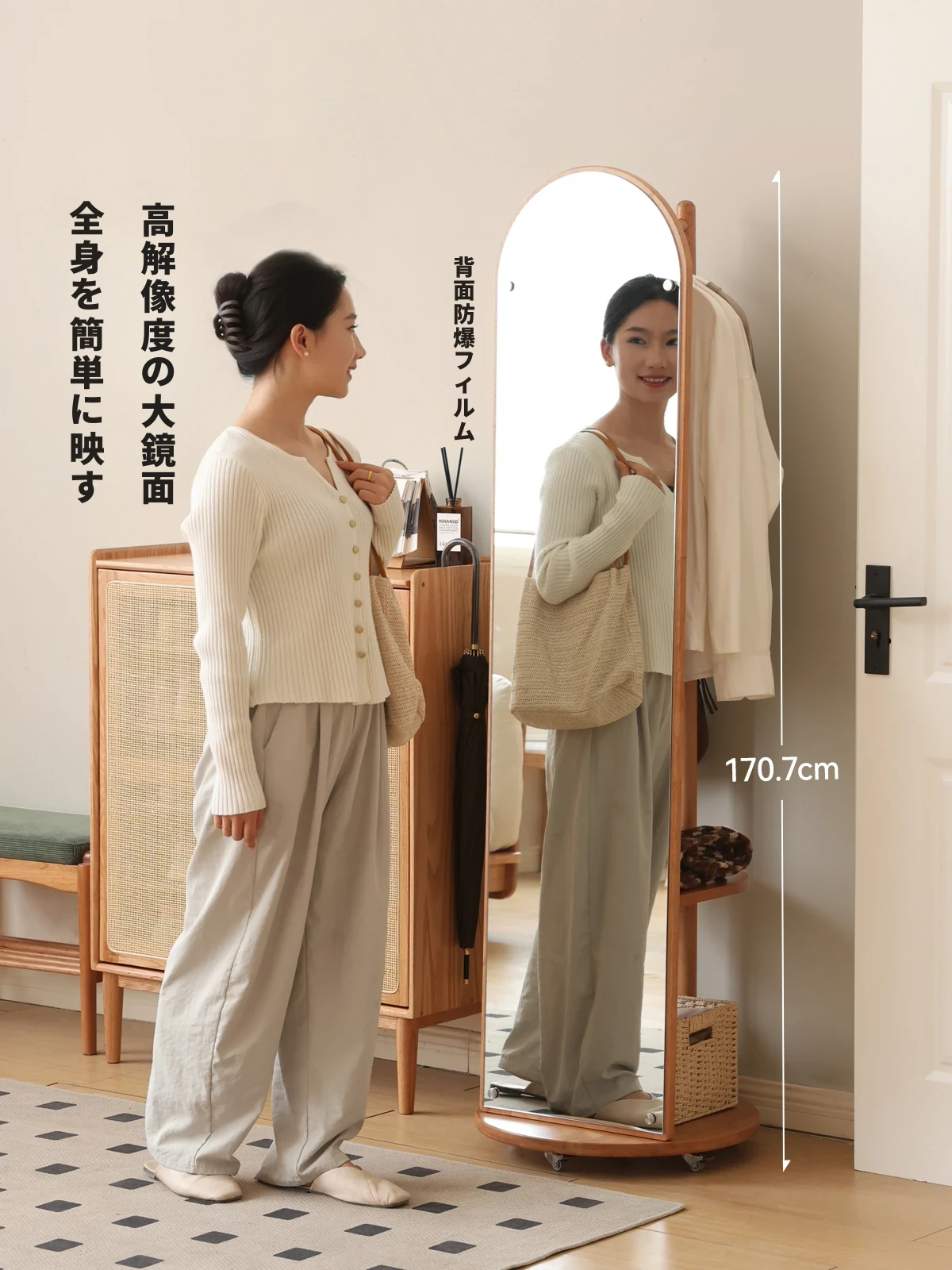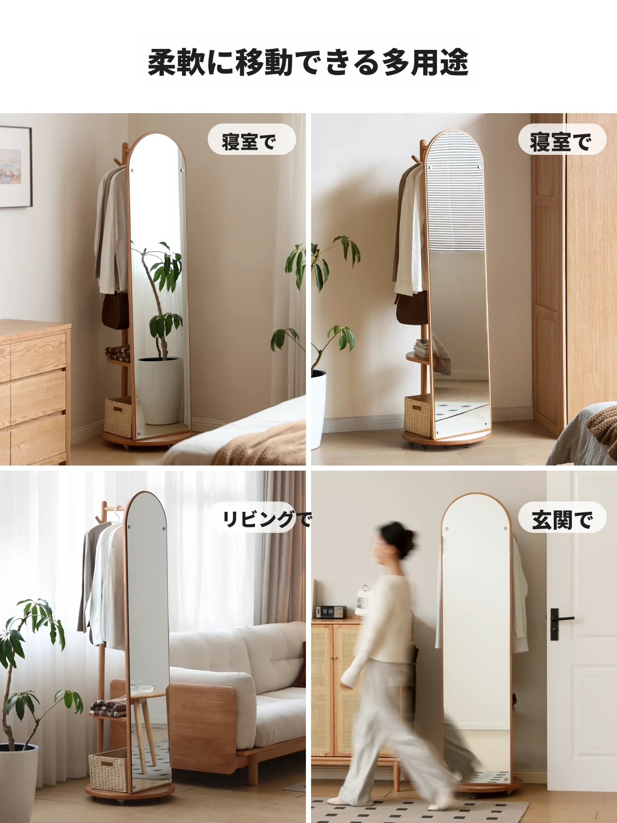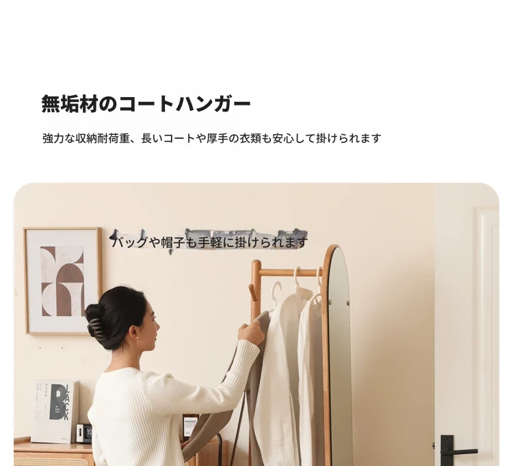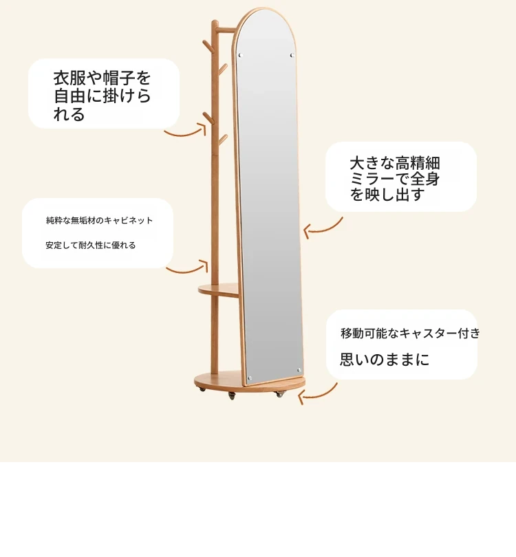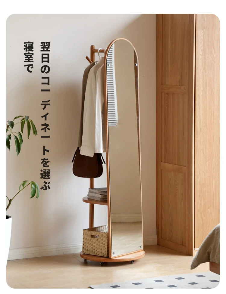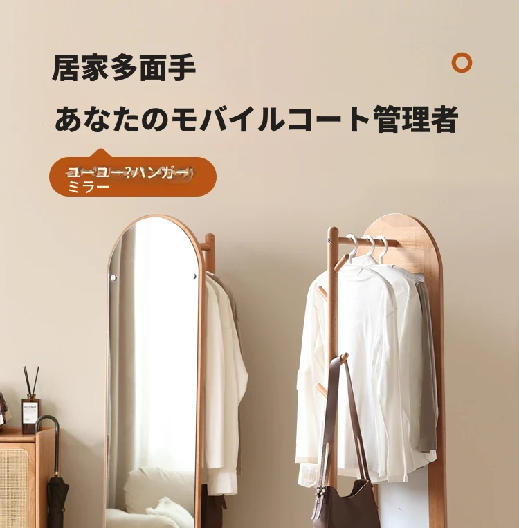 源氏木语×ヴィシャ実木製全身ミラー&コートラック一体型、移動可能な寝室用試着鏡!スタイリッシュで機能的、あなたの毎日を華やかに演出します!