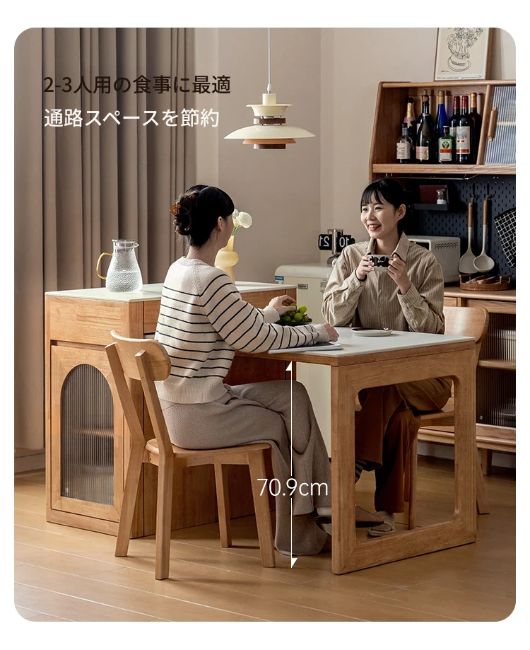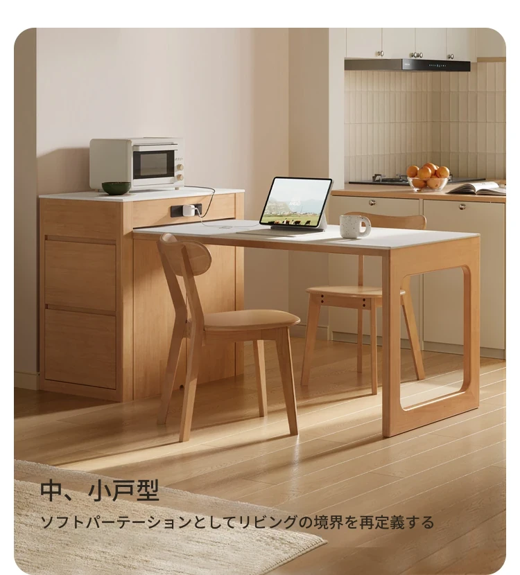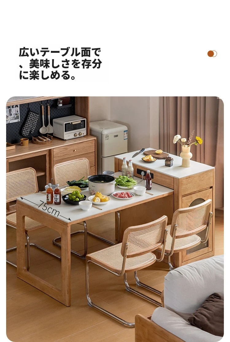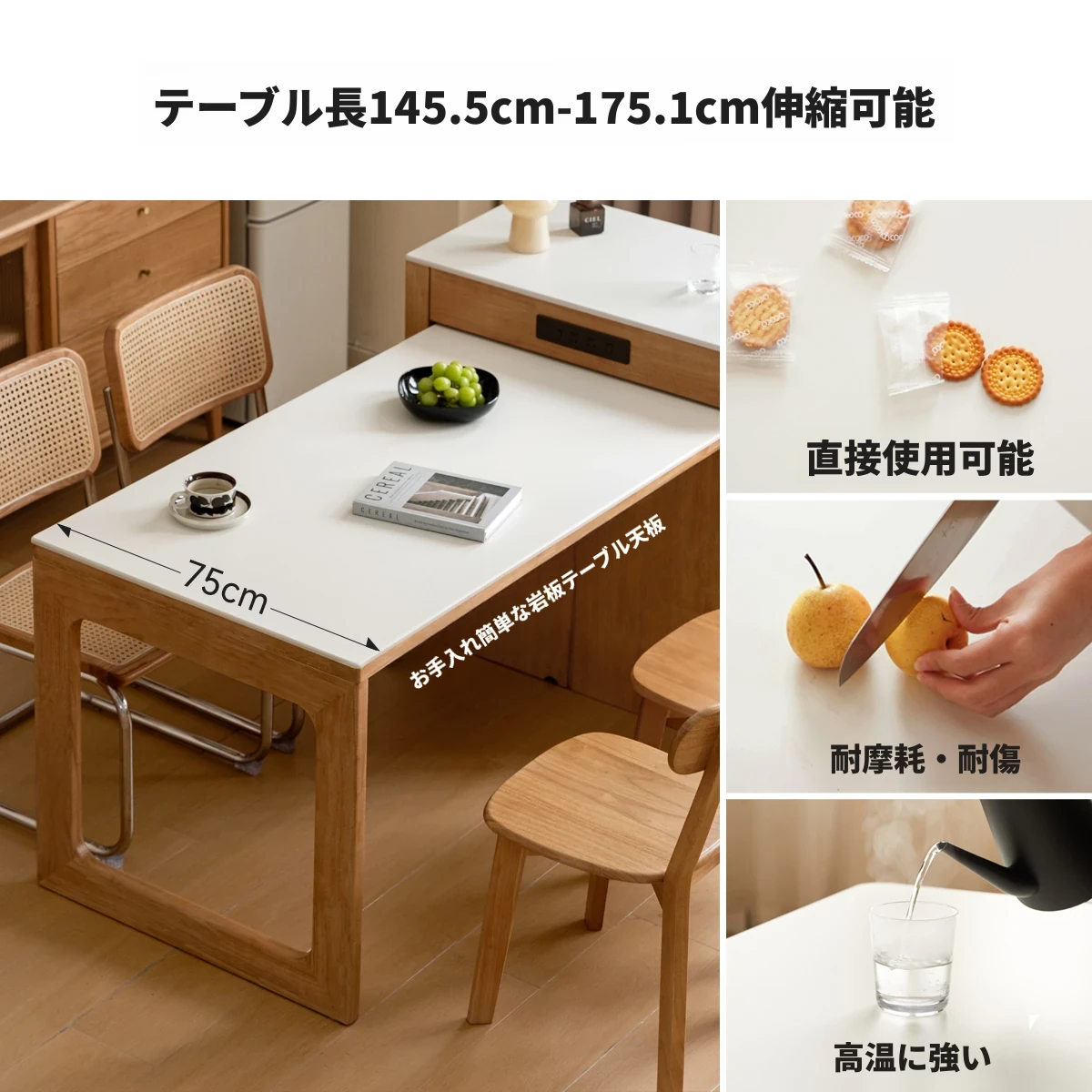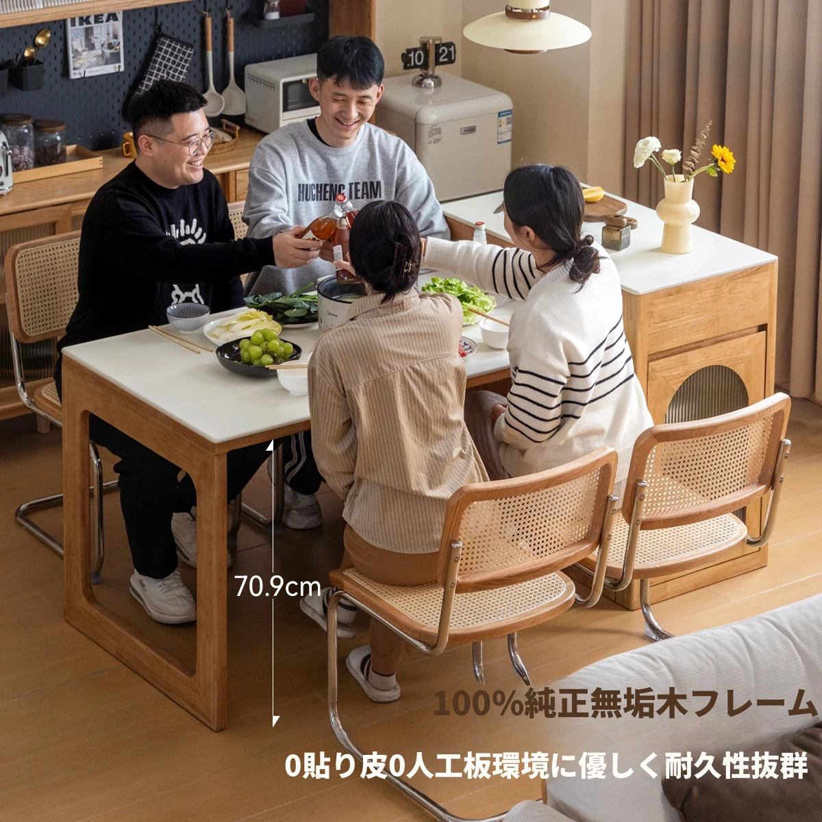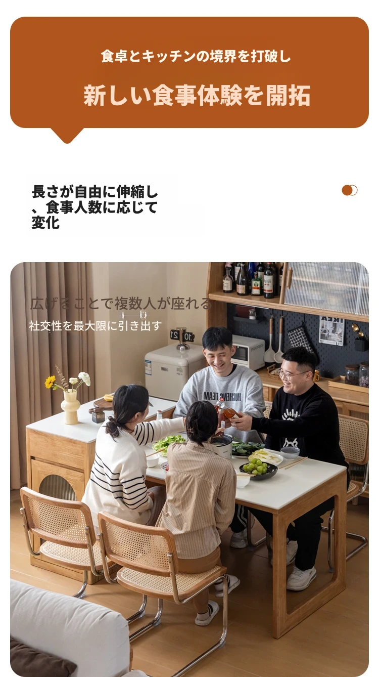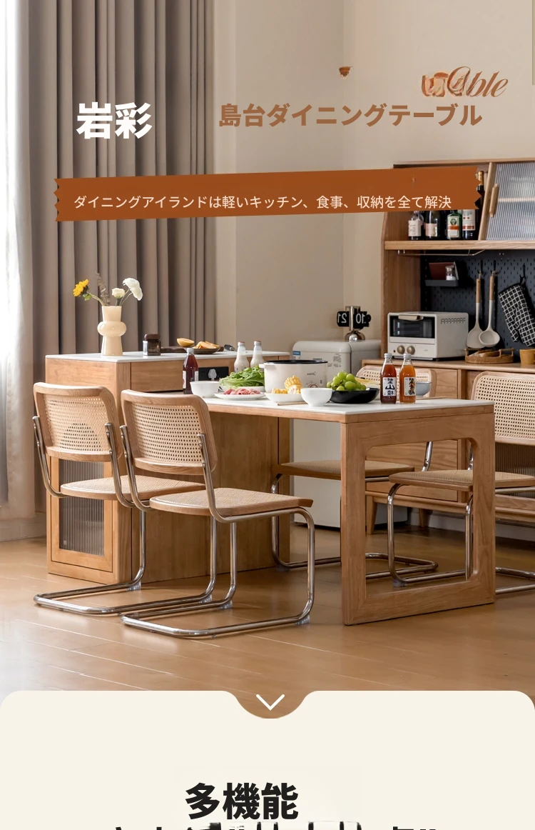 源氏木语×ヴィシャ実木アイランドテーブル|伸縮可能なダイニングテーブル|ナチュラルな木材と高級感ある岩板デザインで、家族団らんの時間をもっと特別に。