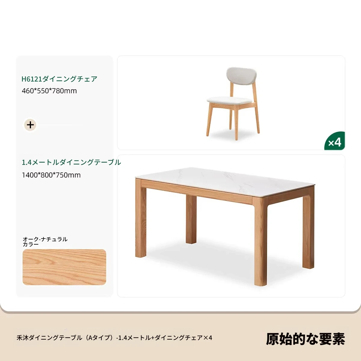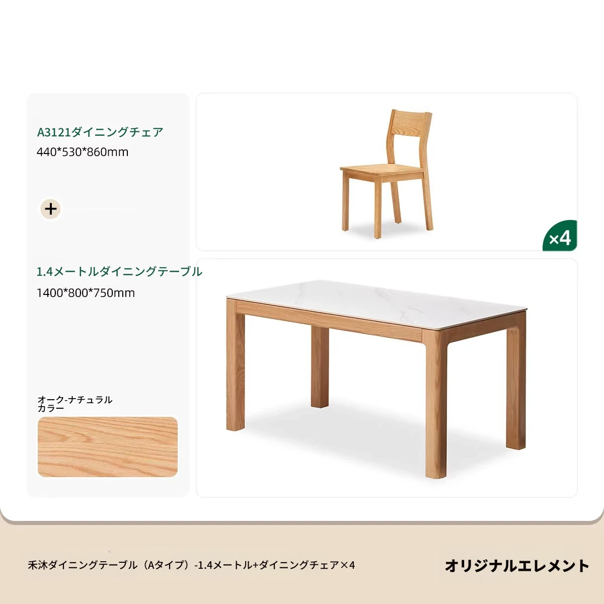 【オーク-ナチュラル】1.4メートル岩板ダイニングテーブル+テヴェクダイニングチェア*4(B1121)