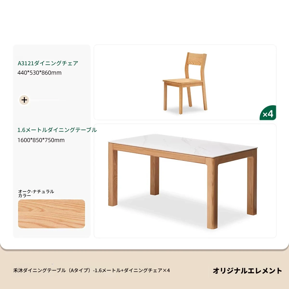【オーク-ナチュラル】1.6メートル岩板ダイニングテーブル+テヴェクダイニングチェア*4(B1121)