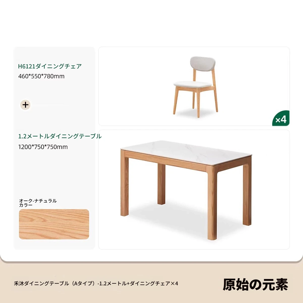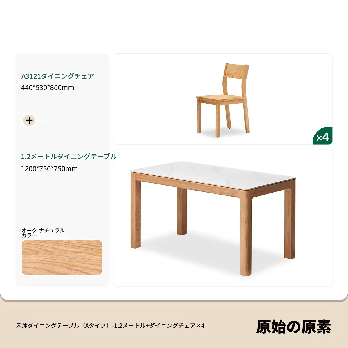 【オーク-ナチュラル】1.2メートル岩板ダイニングテーブル+テヴェクダイニングチェア*4(B1121)