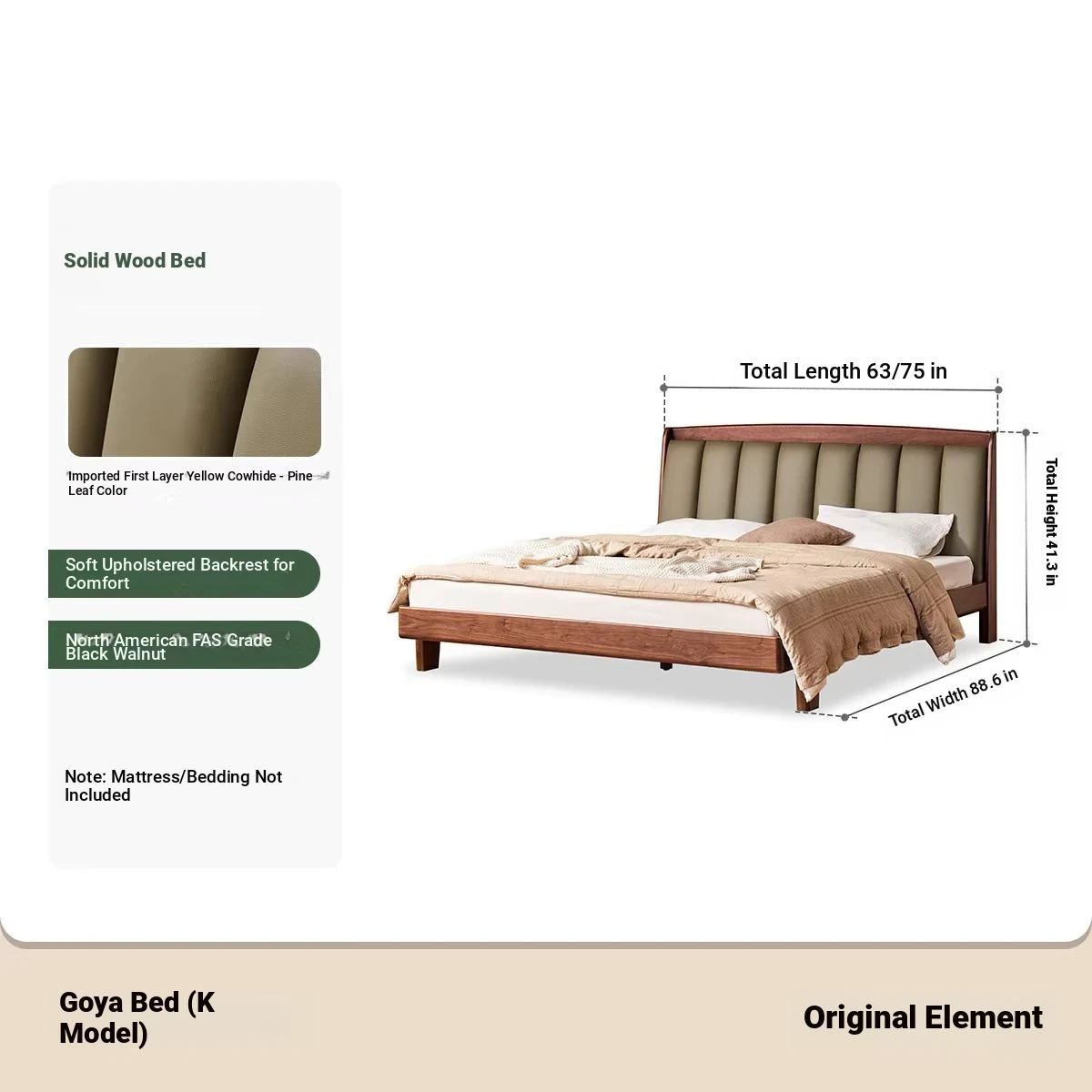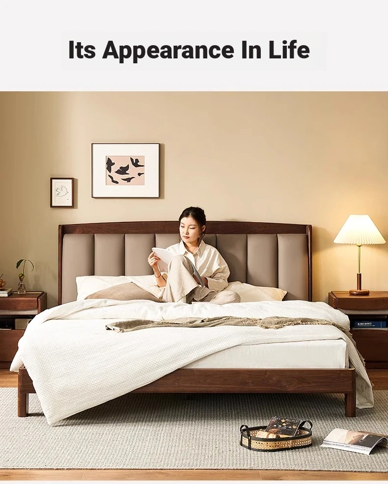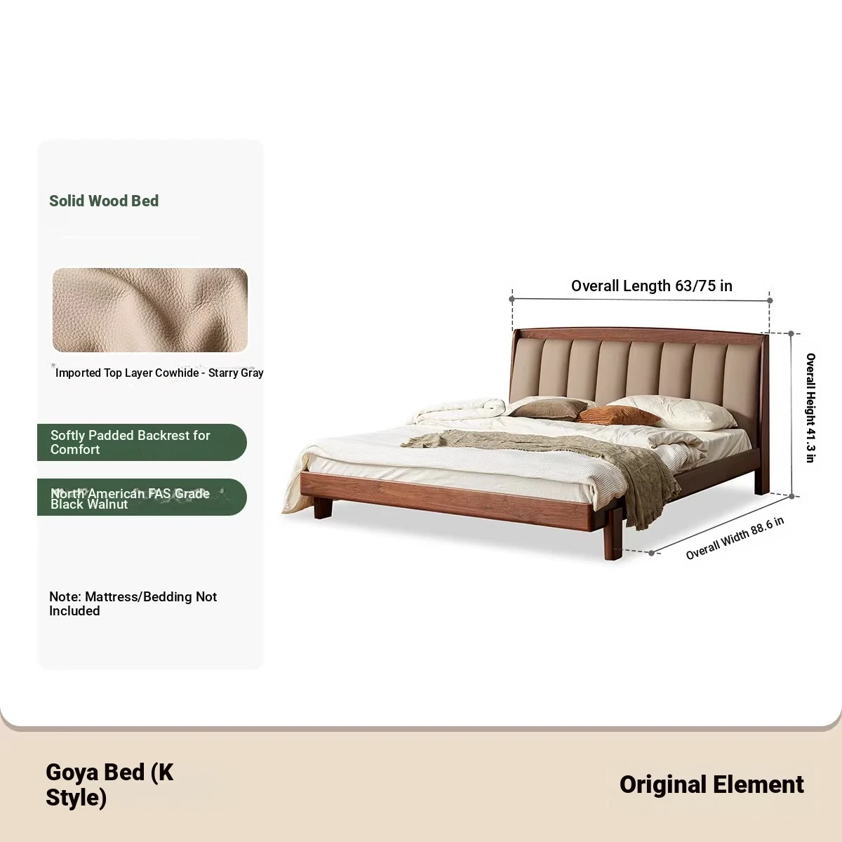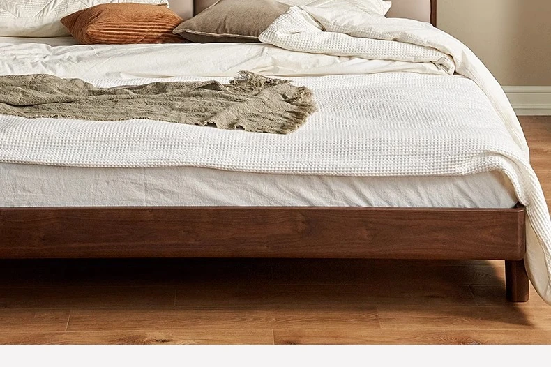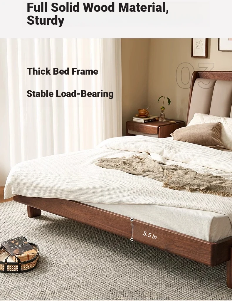 Original Element Solid Wood Bed - Modern Minimalist Design in North American Black Walnut with Genuine Leather Upholstered Headboard - Perfect for Master Bedrooms and Couples