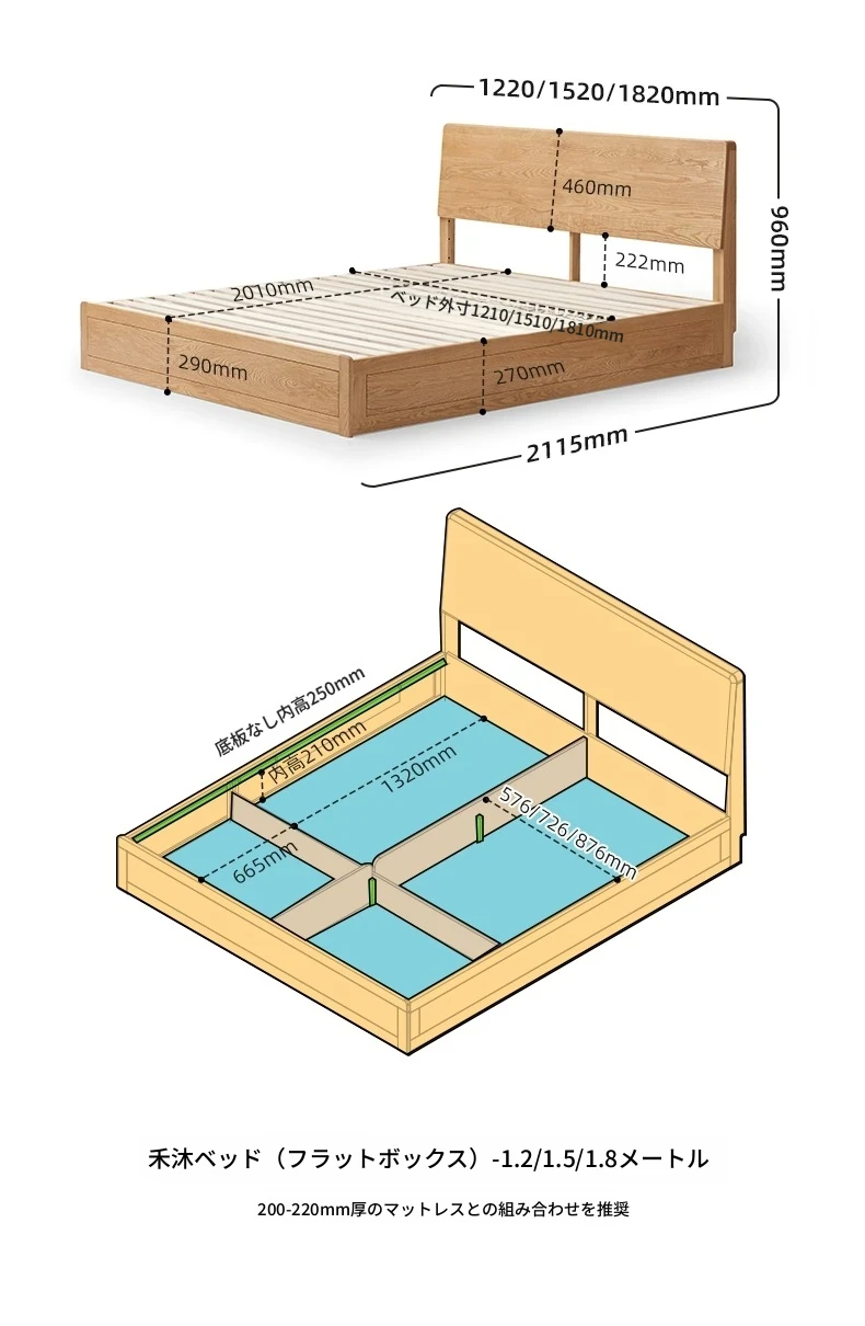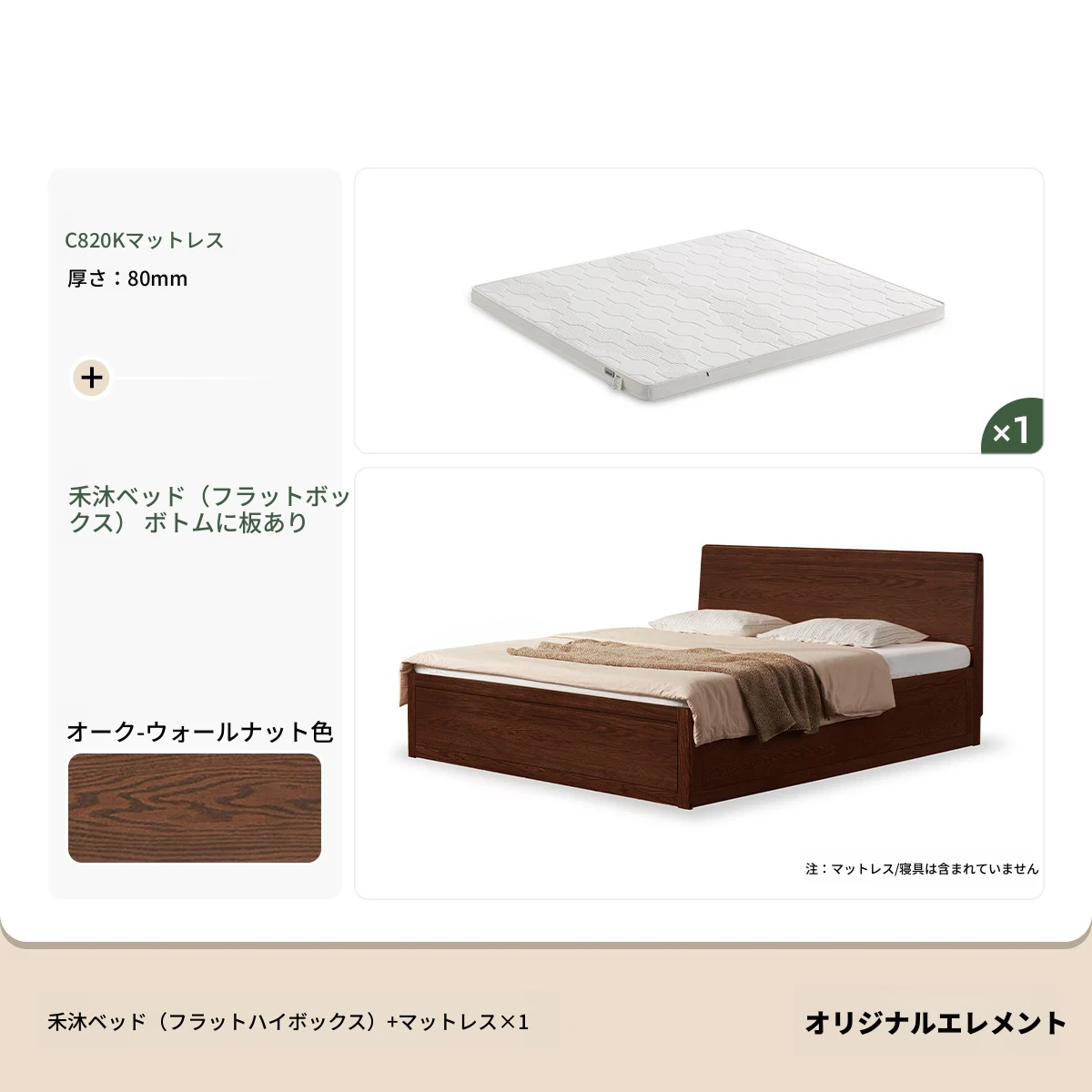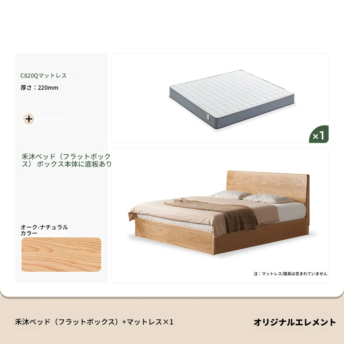 【オーク-ナチュラルカラー】禾沐ベッド(フラットボックス-あり)+原森マットレス(竹炭ココナッツマット)