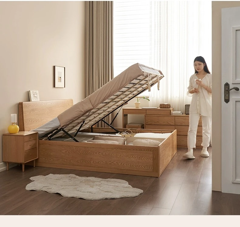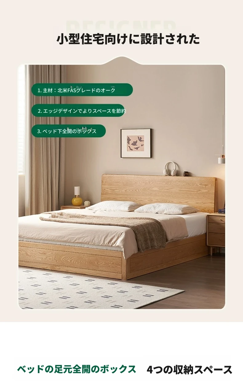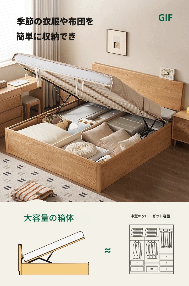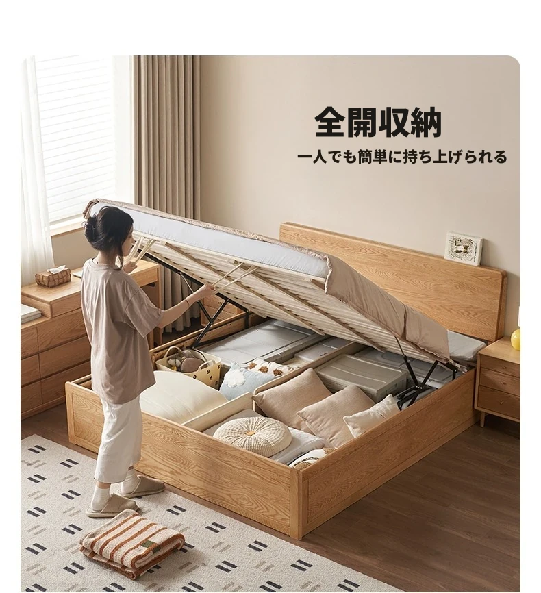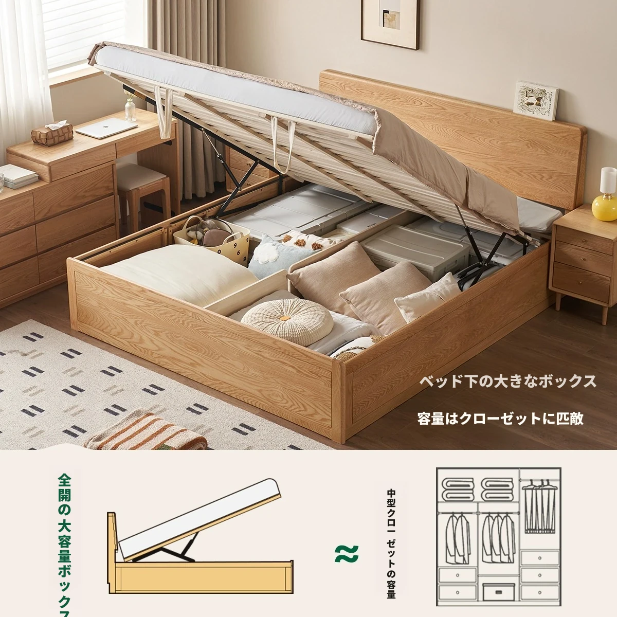 原始のエレメント 無垢材モダンシンプル高収納ベッド オーク全開放型ベッド 小部屋向けダブルベッド 収納力抜群!快適な睡眠空間を提供します。