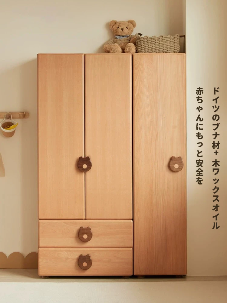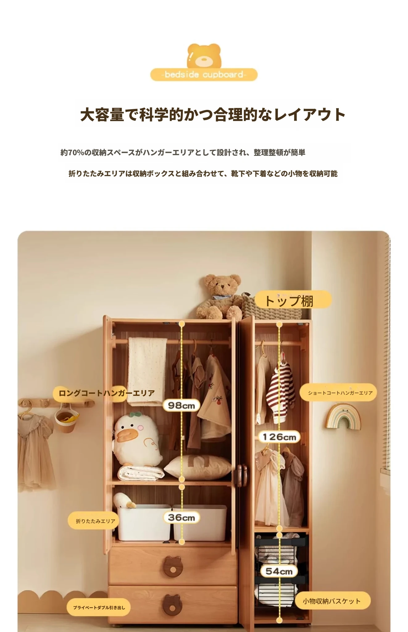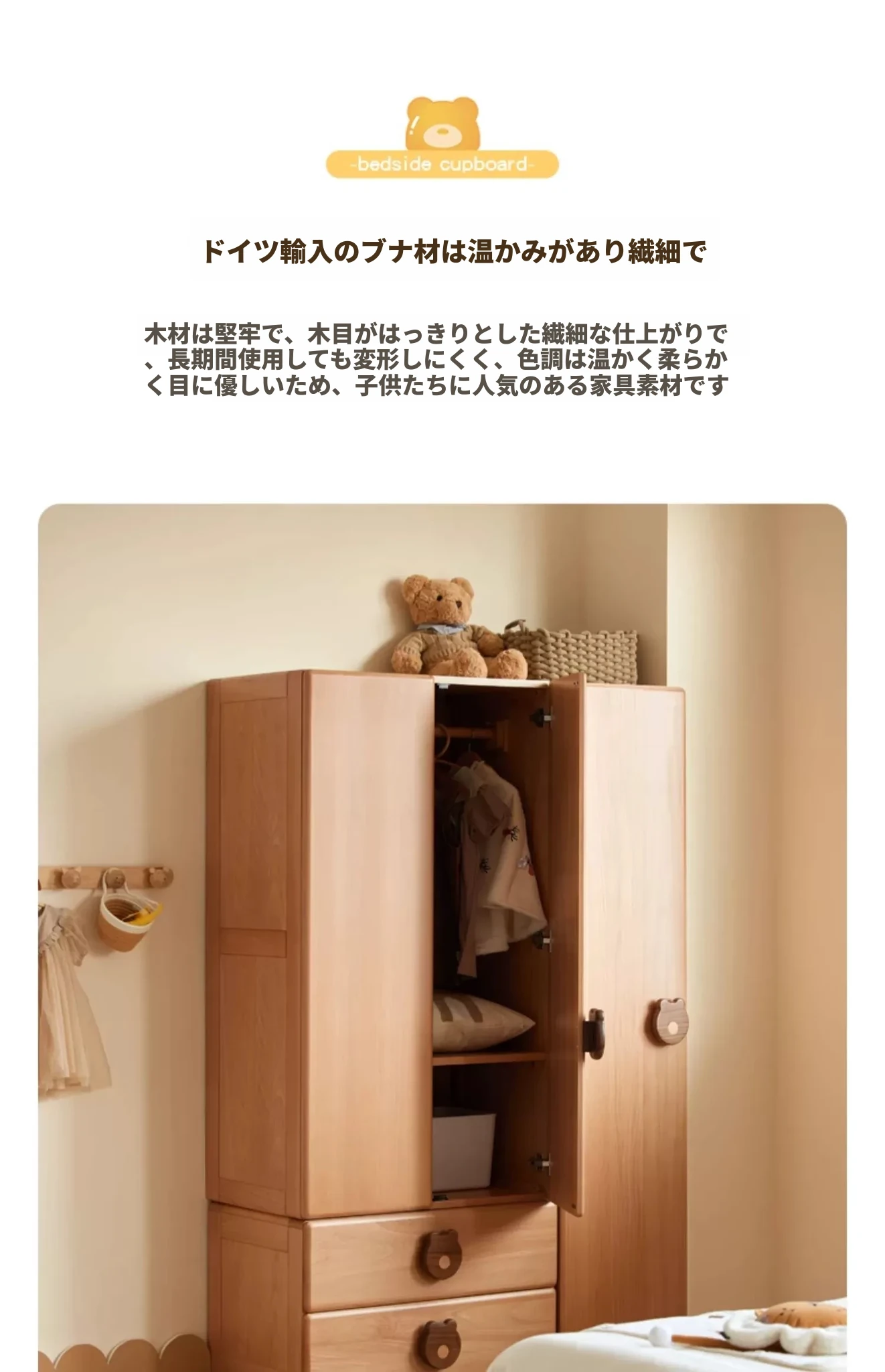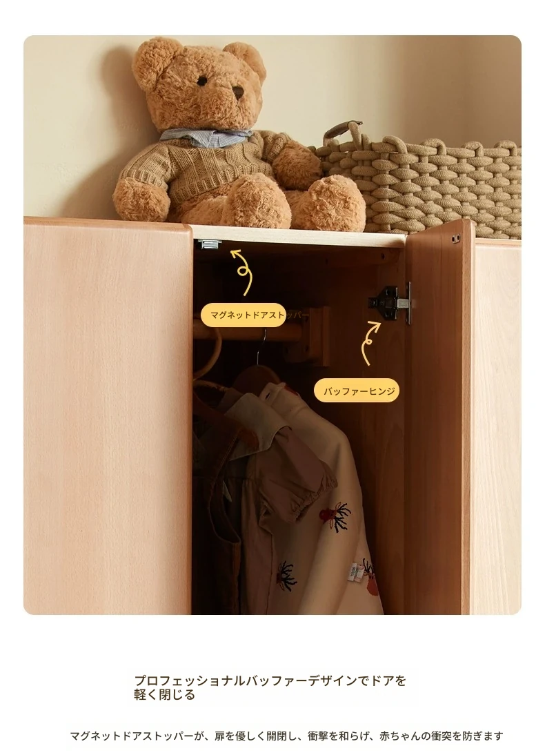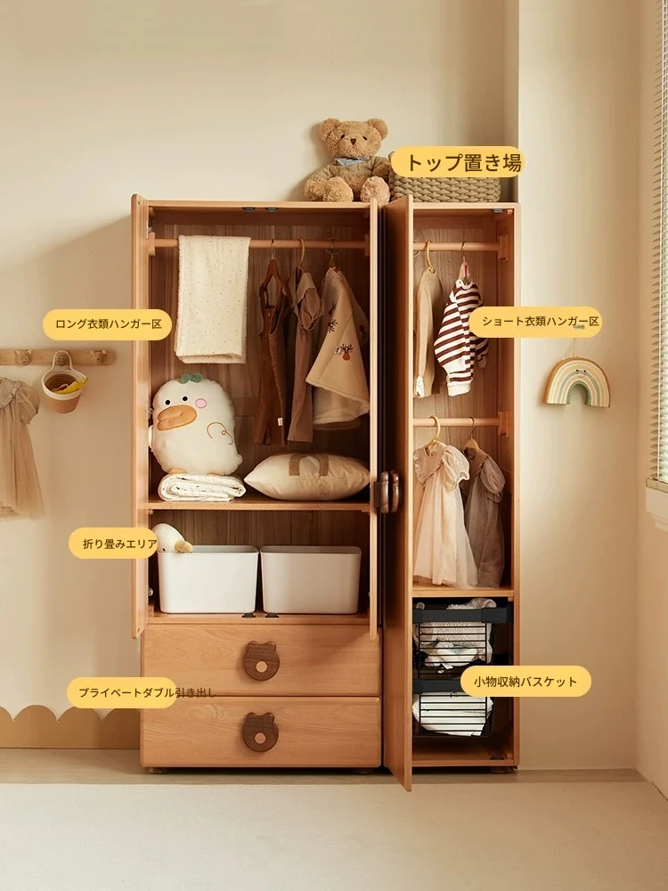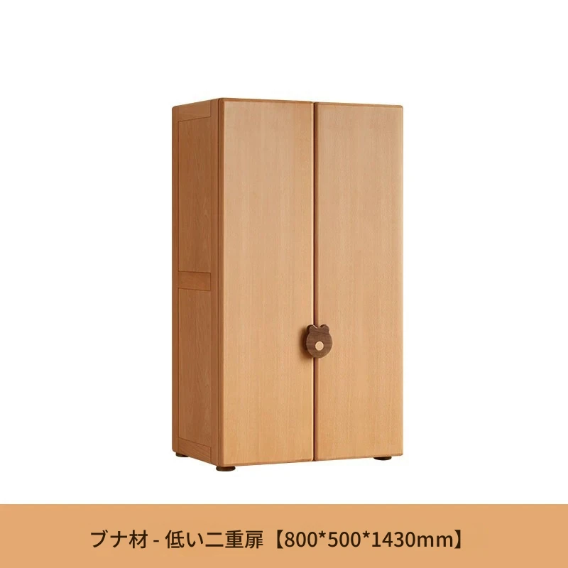 ナチュラルウッド色 ビーチ材の子供用クローゼット(ハイダブルドア)800*500*1430mm