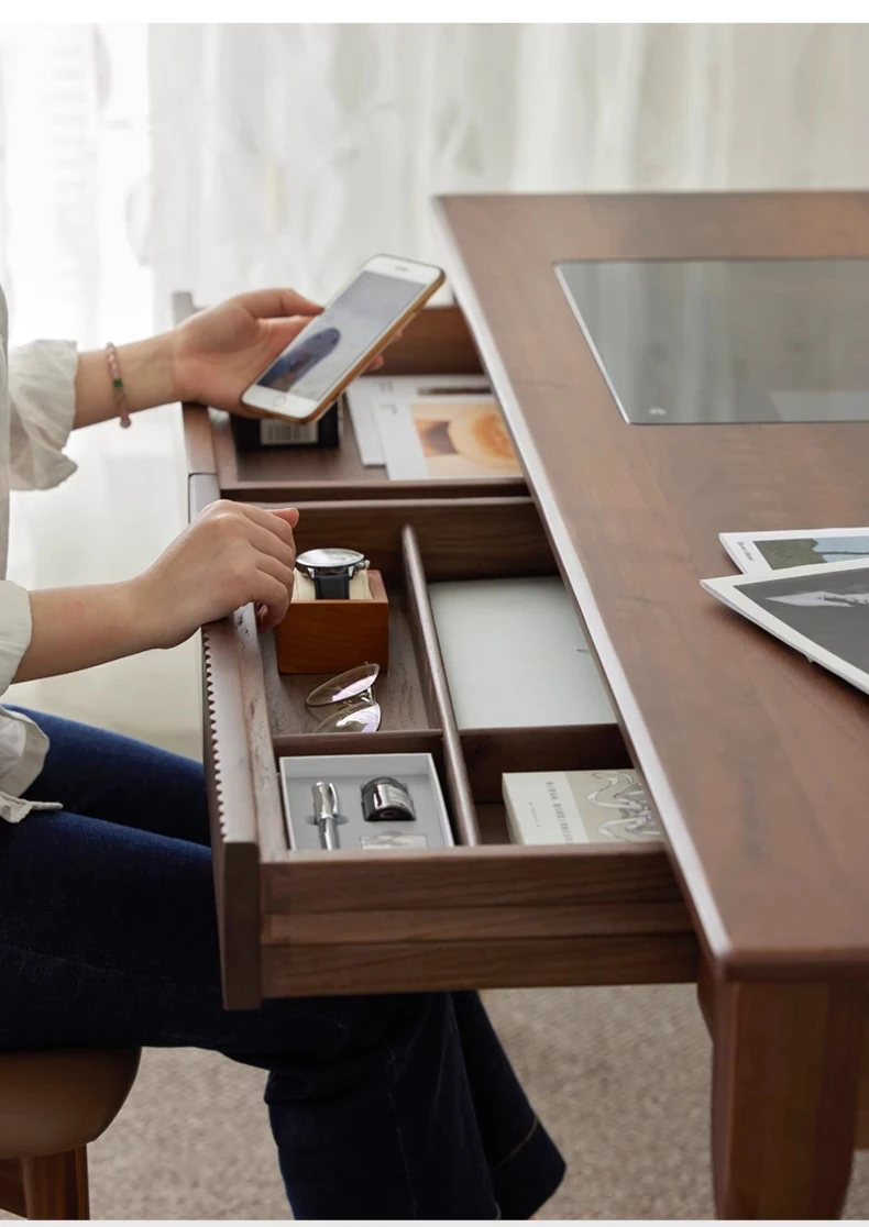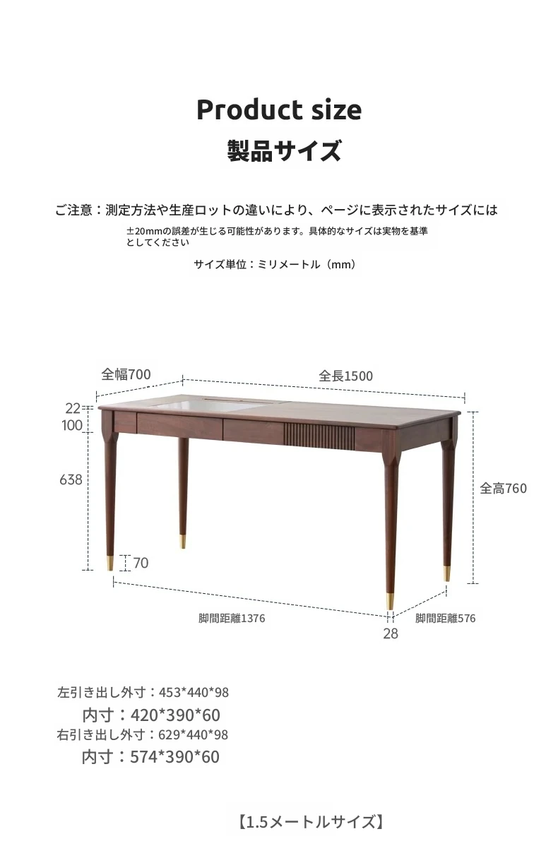 ブラックウォールナット1.5メートルダブルドロワーデスク(LEDライト付き)(1500*700*760mm)