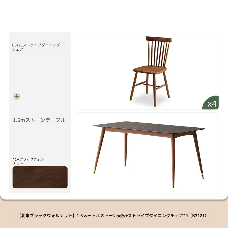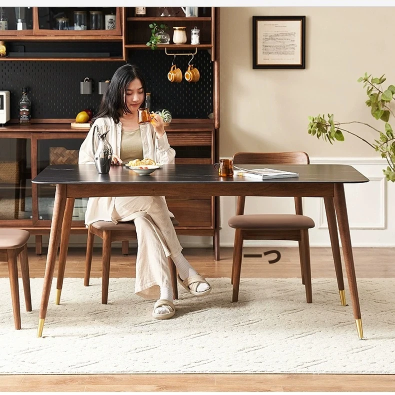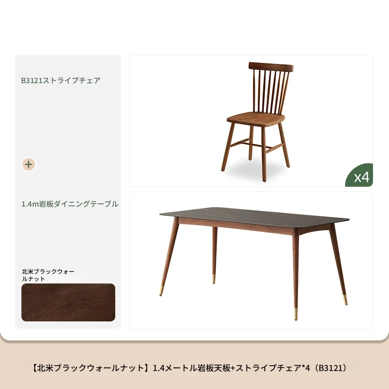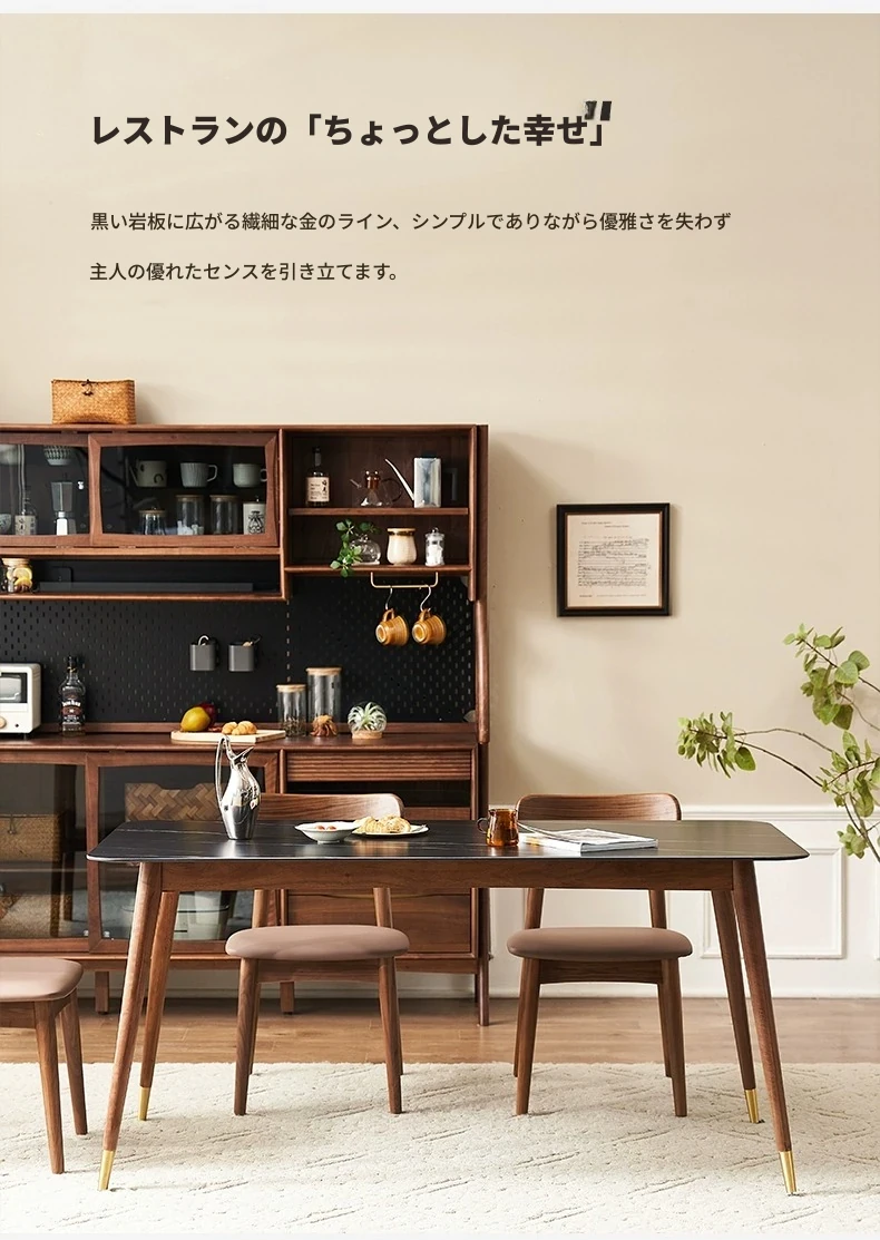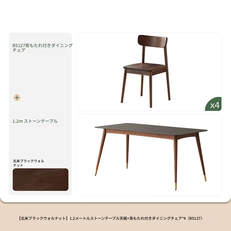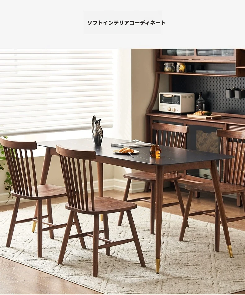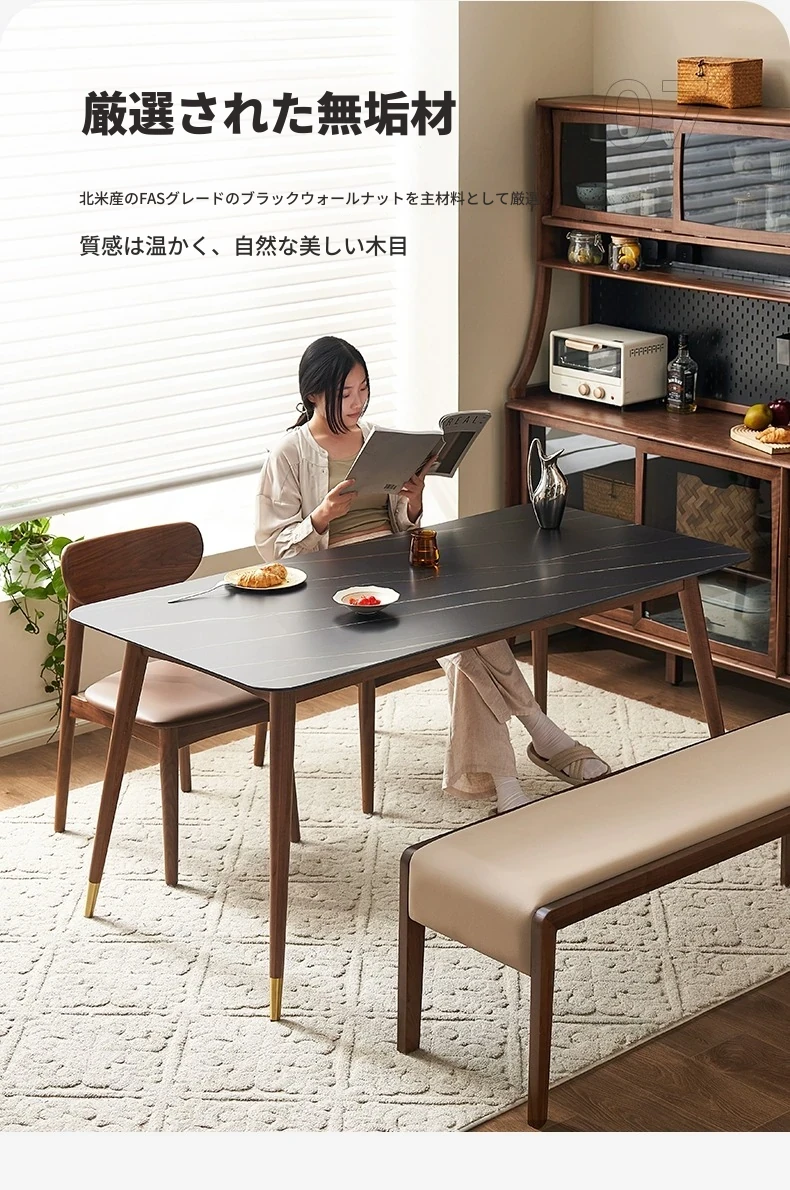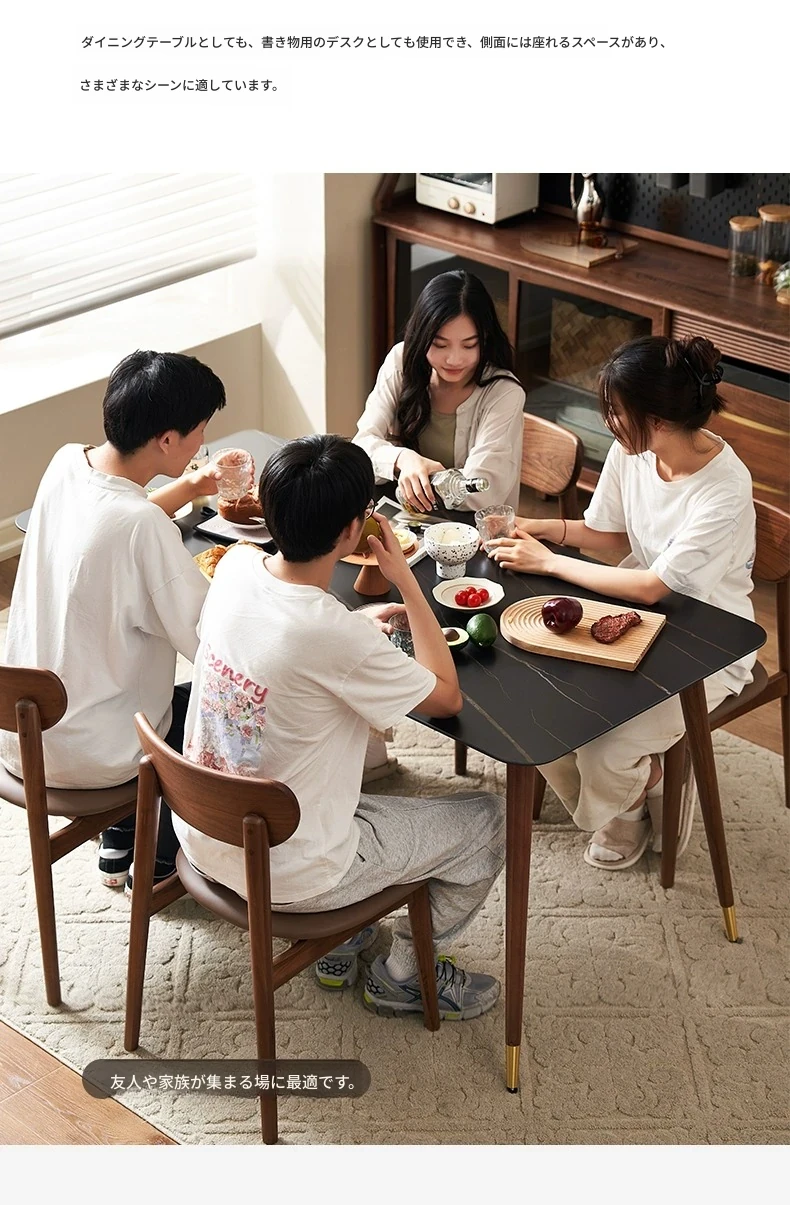 高級感あふれる無垢材ダイニングテーブルセット - ブラックウォールナットと岩板のコンビネーション、小型住宅に最適な使い勝手抜群の食卓。あなたの食事シーンを格上げする一品です。